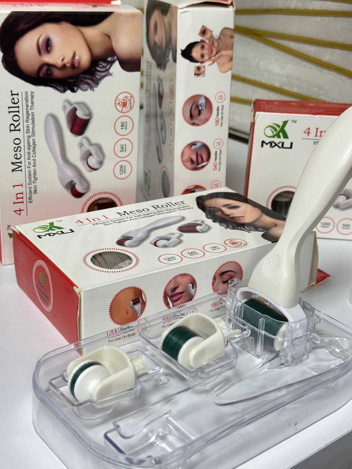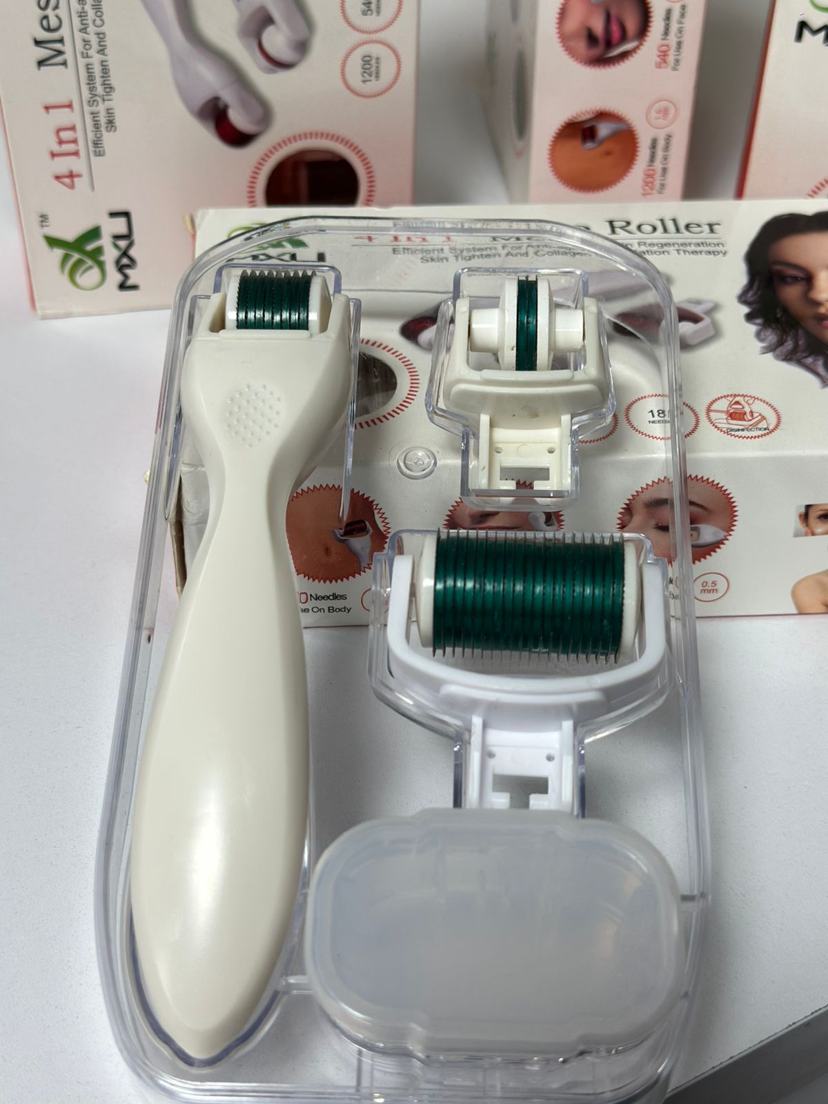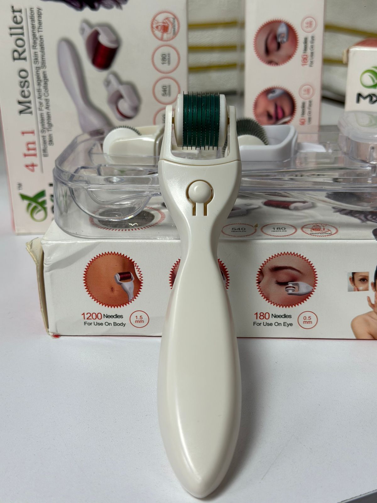 El Meso Roller System 4 en 1 es un eficiente sistema antiedad. Regenera la piel y estimula el colágeno. Incluye tres opciones de agujas: 1200, 540 y 180. Perfecto para rutinas de cuidado personal.