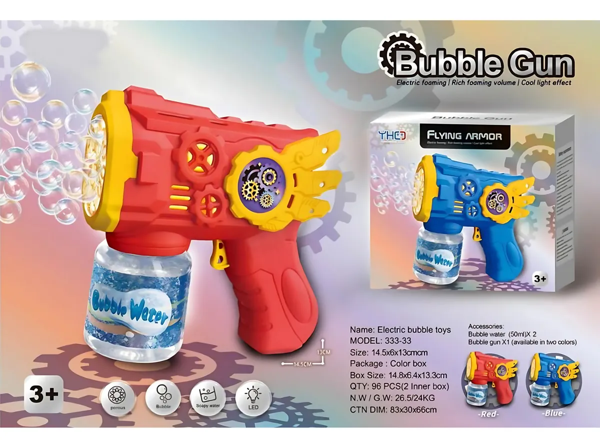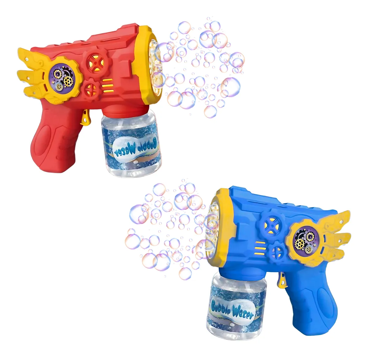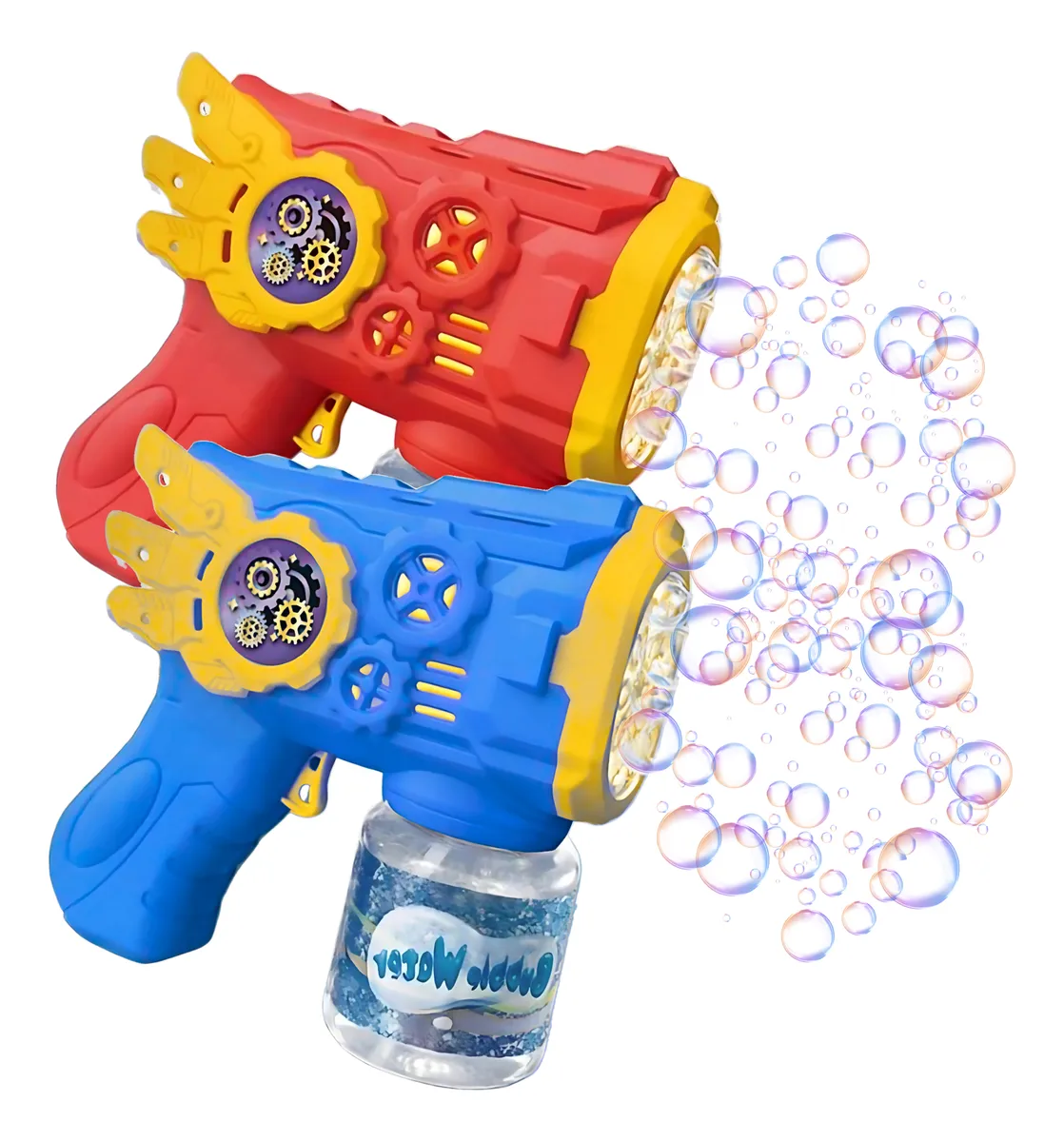 ¡Diviértete con esta pistola de burbujas de diseño único en colores azul y rojo! Con un estilo inspirado en engranajes y tuercas, y alas integradas, es una opción divertida y práctica para los más pequeños.