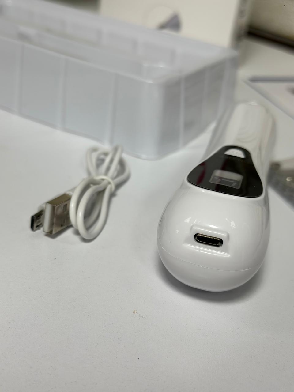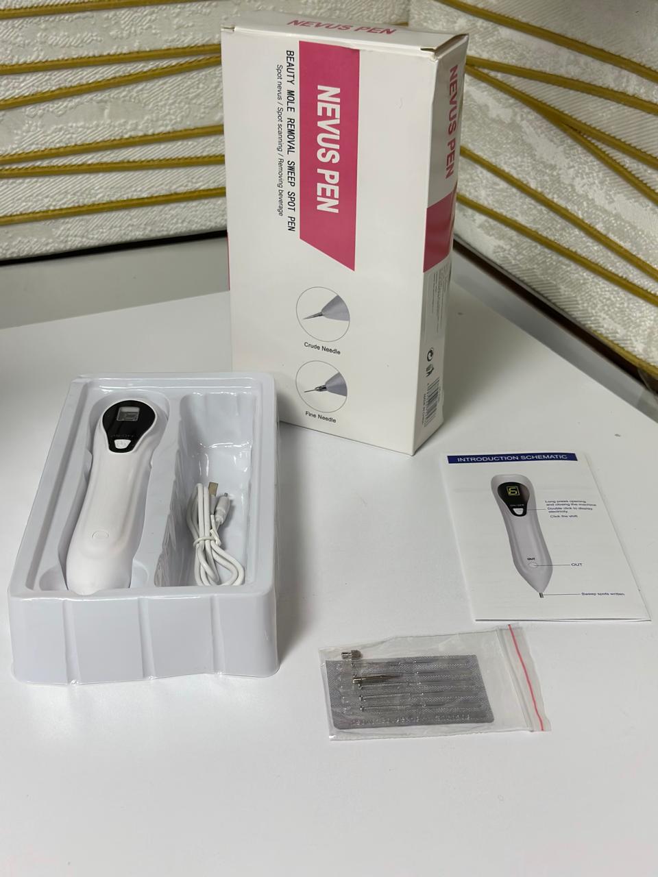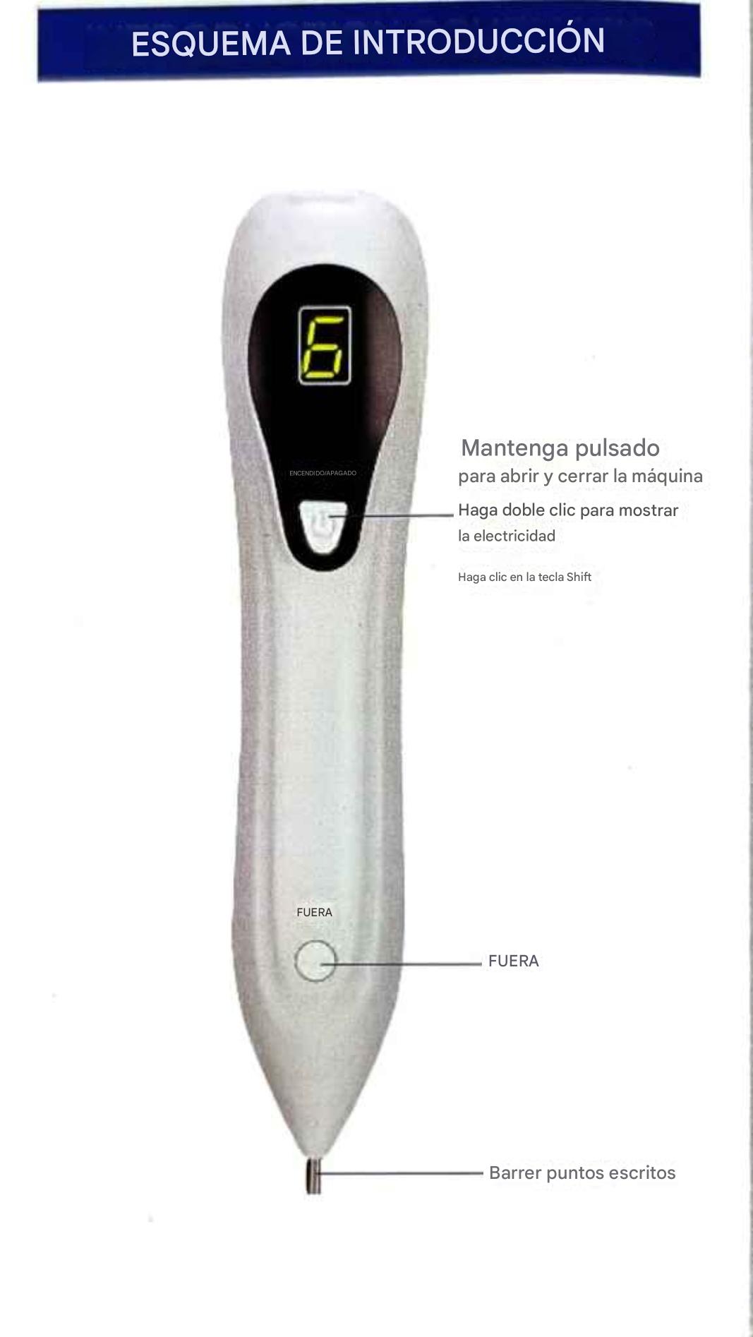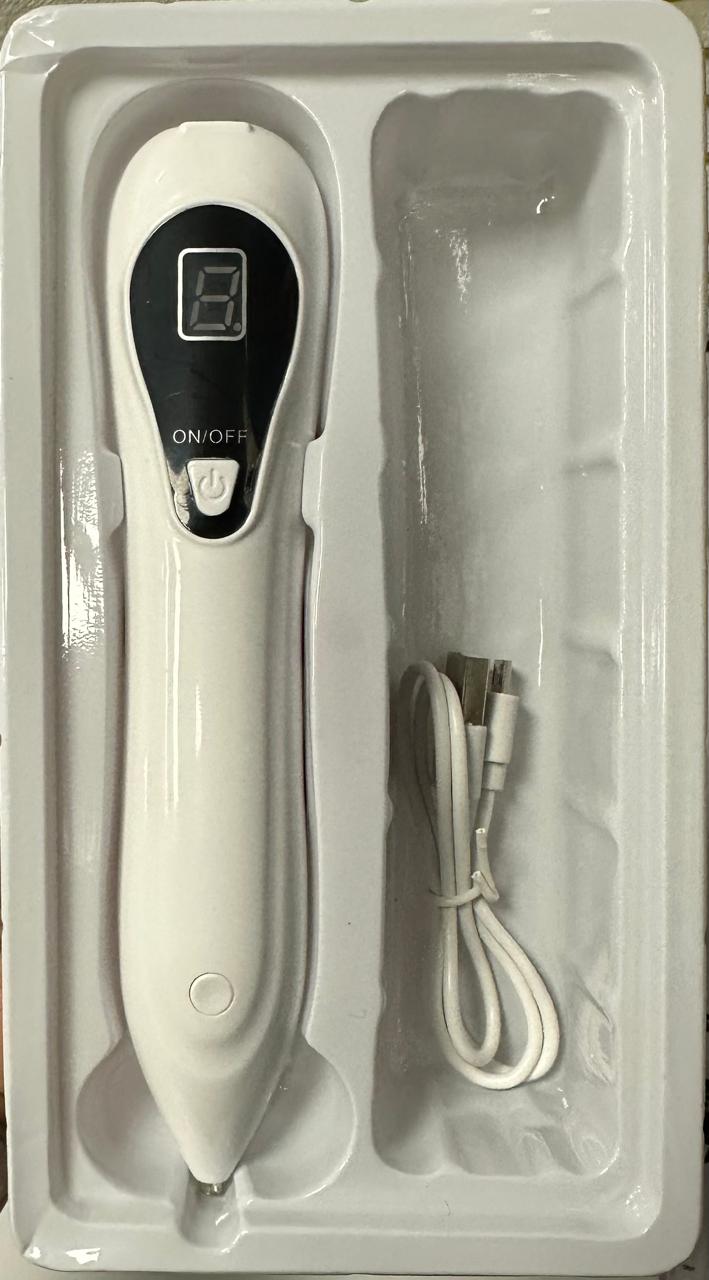 Pluma recargable cauterizadora de verrugas con puntas intercambiables de 6 niveles de intensidad con boton para intercambiar niveles.