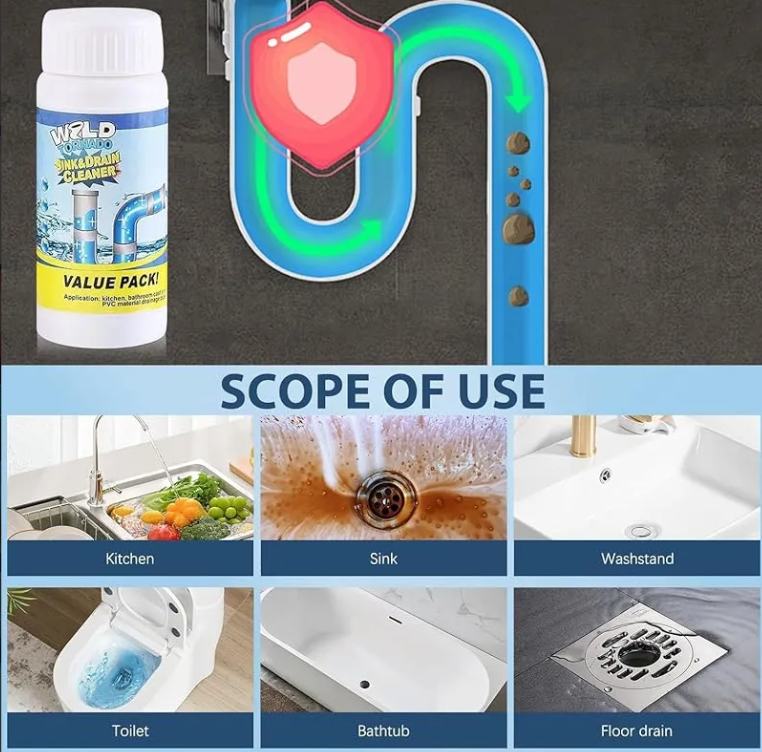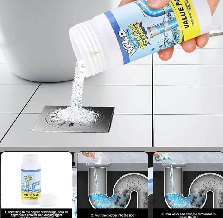 - Uso recomendado: Aplicar el polvo en el desagüe del fregadero, bañera, inodoro u otras tuberías obstruidas. Seguir las instrucciones del producto para garantizar su efectividad.